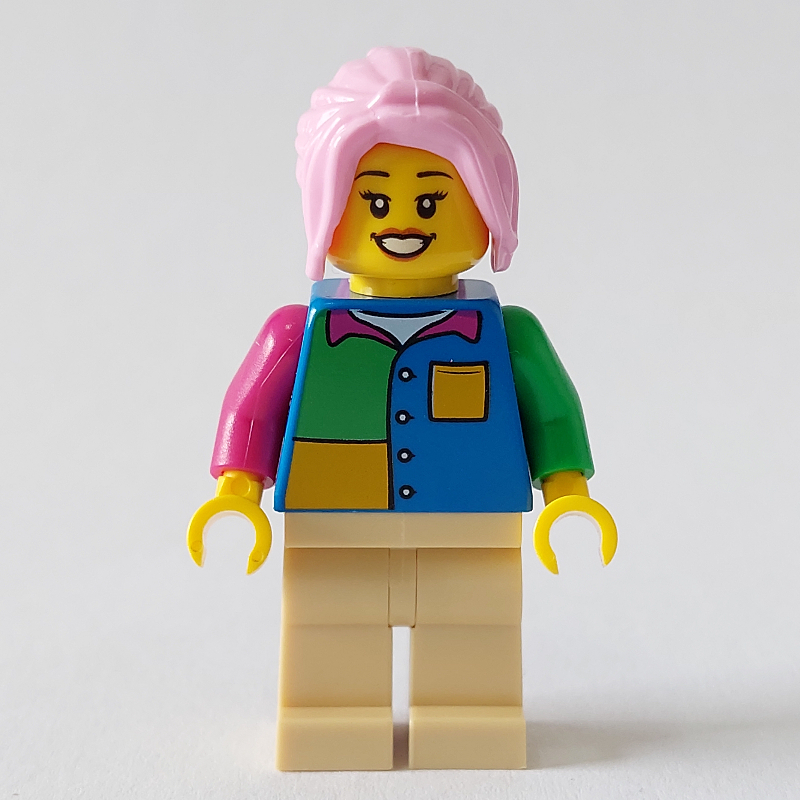Woman, Blue, Yellow, and Green Shirt, Bright Pink Hair